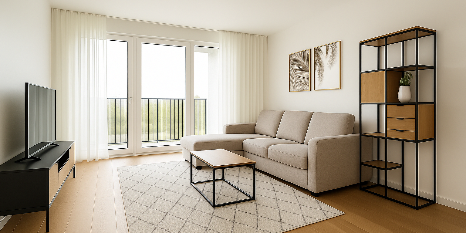 See elutuba on kujundatud kaasaegses skandinaavia stiilis, kus domineerivad puhtad jooned, naturaalne valgus ja soojad puidutoonid.