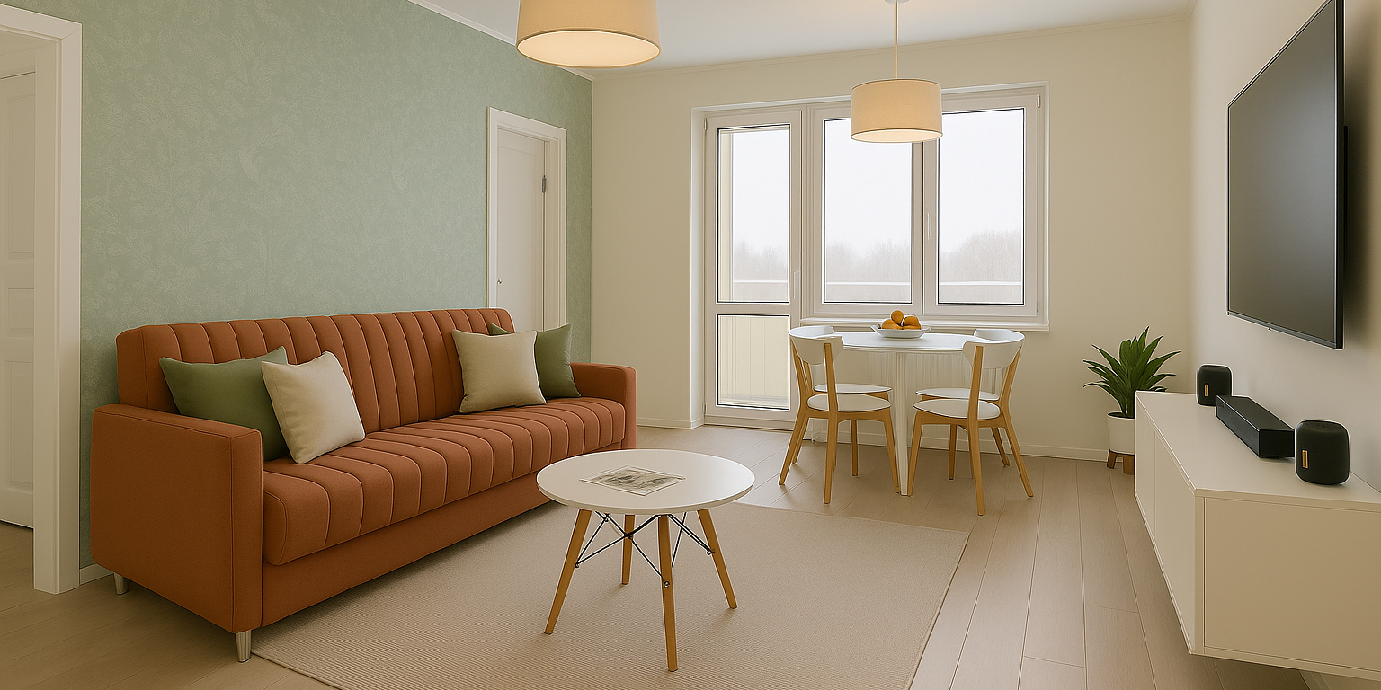 See on valgusküllane ja hubane elutuba paneelmaja korteris, kus on kaasaegne ja praktiline sisekujundus. Soojades toonides diivanvoodi pakub mugavat istumisvõimalust ning vajadusel saab selle lahti teha külaliste voodiks. Akna all olev söögilaud on pikendatav ja sobib hästi igapäevasteks eineteks ning ka suuremateks koosviibimisteks. See elutuba on praktiline, avar ja sobib hästi noorele perele või paarile.