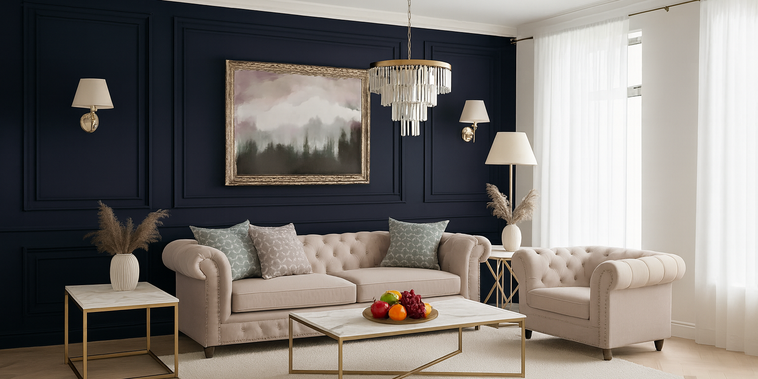 See klassikalises stiilis elutuba ühendab elegantsi ja hubasuse. Tumedad seinad toovad esile heleda sametise diivani ning tugitooli, mida täiustavad kuldsed detailid ja stiilsed kohvilauad. Lühter ja seinalambid loovad ruumi sooja valguse ning akendest langev looduslik valgus lisab õhulisust. See on ideaalne lahendus neile, kes hindavad ajatut luksust ja väärikat ning klassikalist sisekujundust.